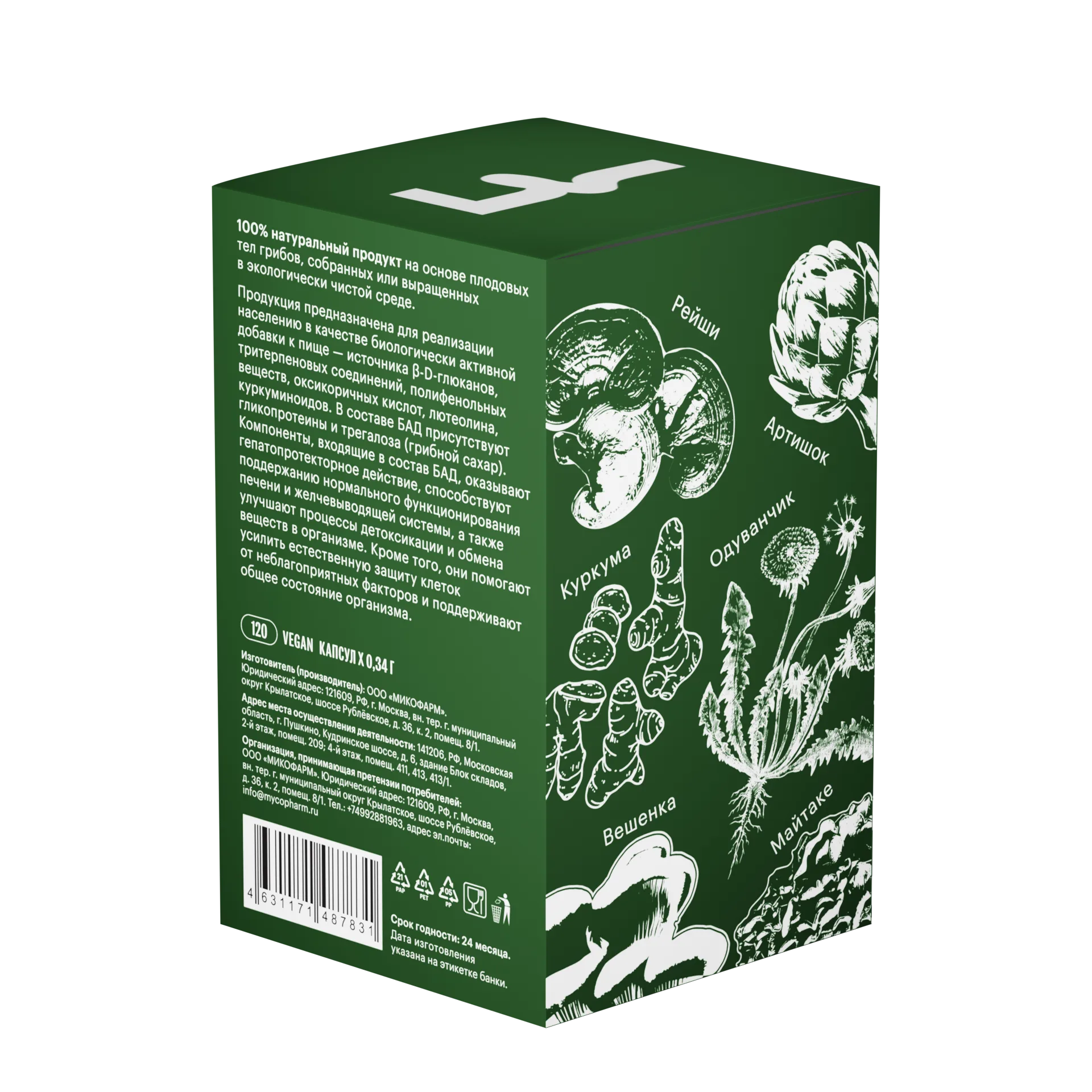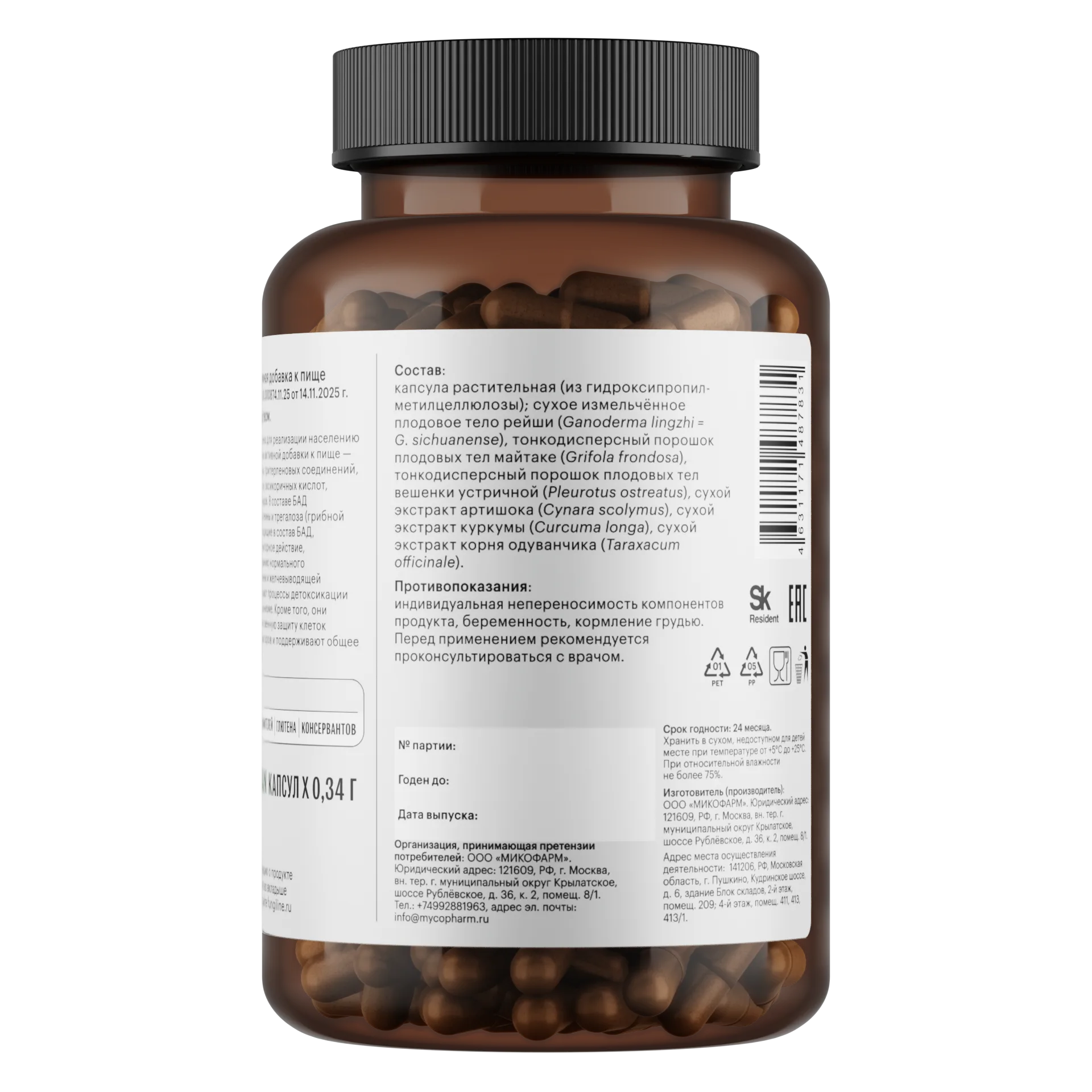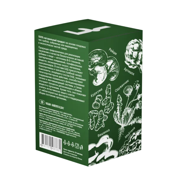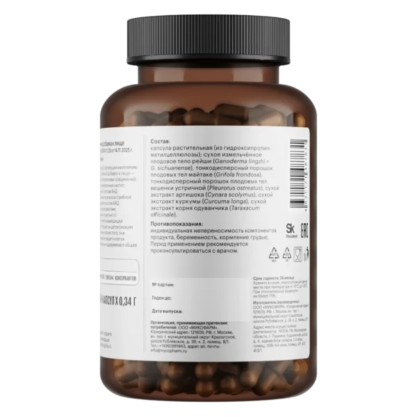 Тонкодисперсный порошок плодовых тел рейши (Ganoderma lingzhi), майтаке (Grifola frondosa), вешенки устричной (Pleurotus ostreatus) низкотемпературной сушки; экстракт куркумы (Curcuma longa), экстракт корня одуванчика (Taraxacum officinale), экстракт артишока (Cynara scolymus).